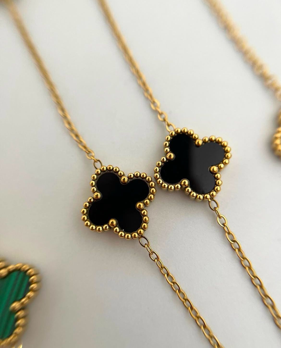 El clásico que se pone oscuro y misterioso. Inspirado en el icónico diseño Van Cleef & Arpels, este collar lleva la famosa forma de cuatro hojas (trèfle) en negro profundo y elegante, con bordes perlados dorados que aportan textura artesanal y un contraste sofisticado. Cada motivo está conectado por una cadena fina de eslabones redondos en baño oro 18k, creando un efecto ligero, fluido y femenino con un aire de lujo nocturno.