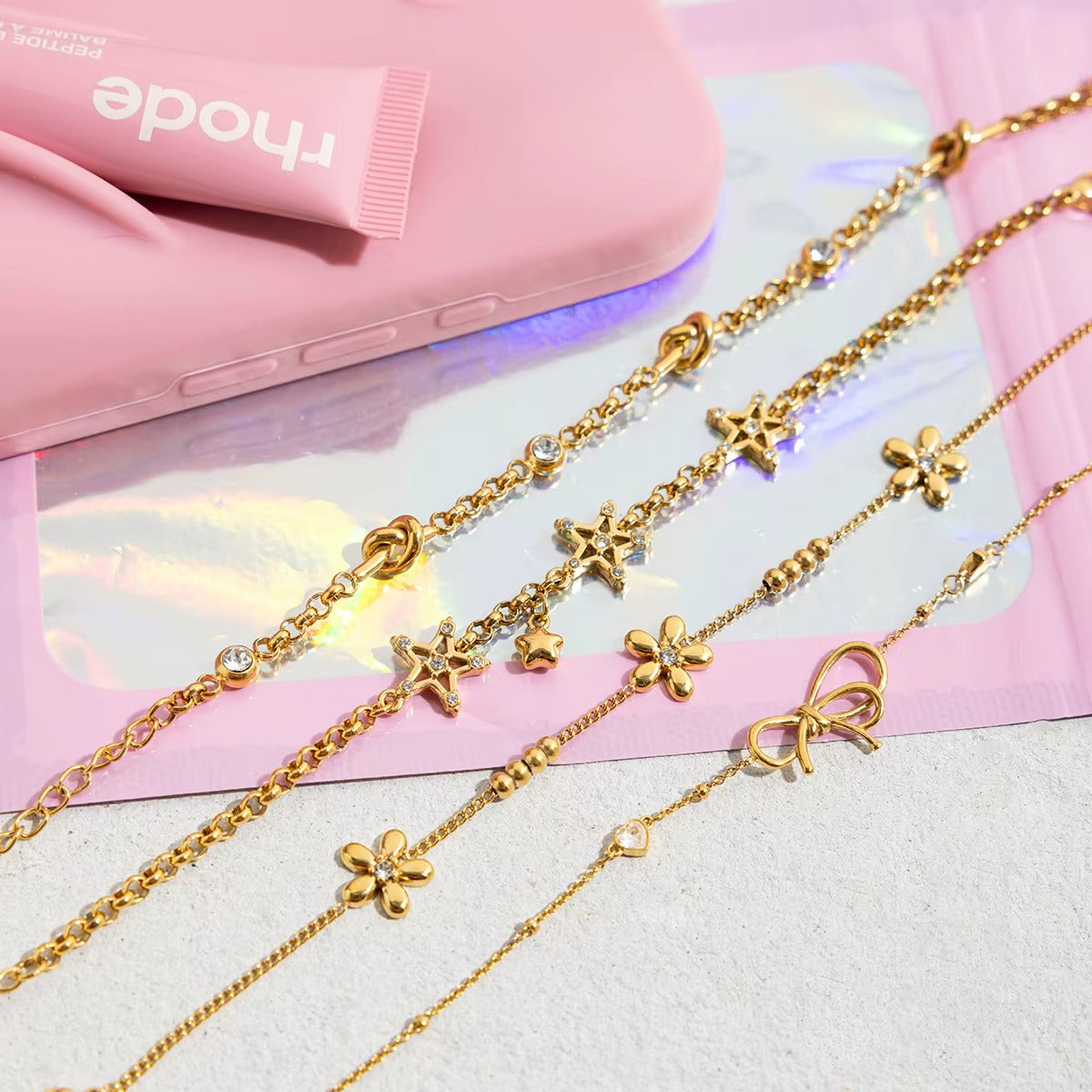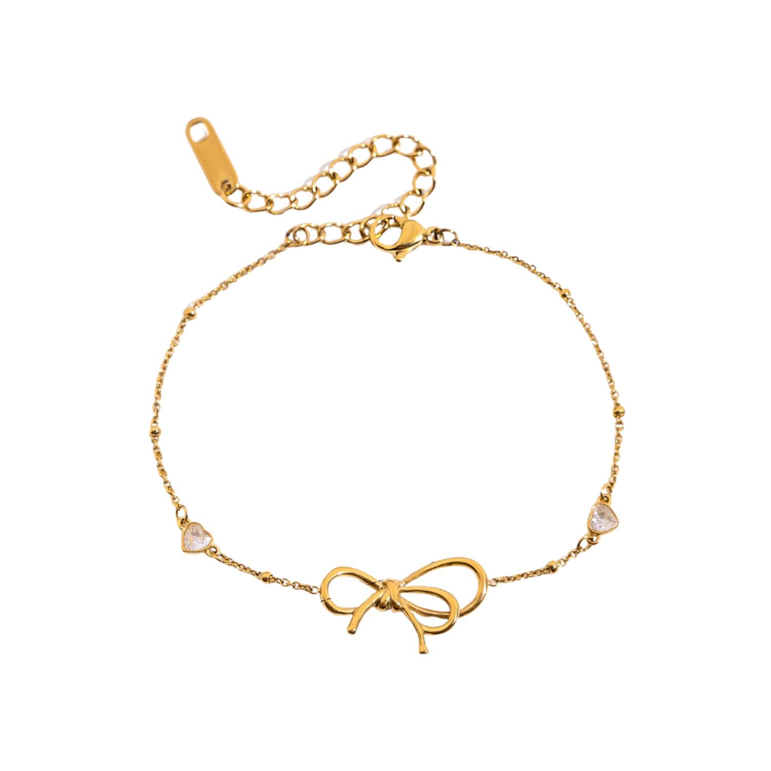 Un lazo que ata tu corazón al estilo. Cadena fina y delicada bañada en oro 18k, con un charm central en forma de moño grande y elegante que roba miradas. A los lados, pequeños corazones abiertos incrustados con cristales rosados brillantes (CZ de alta calidad) que destellan con cada movimiento, aportando ese toque coqueto y romántico que todas amamos.
