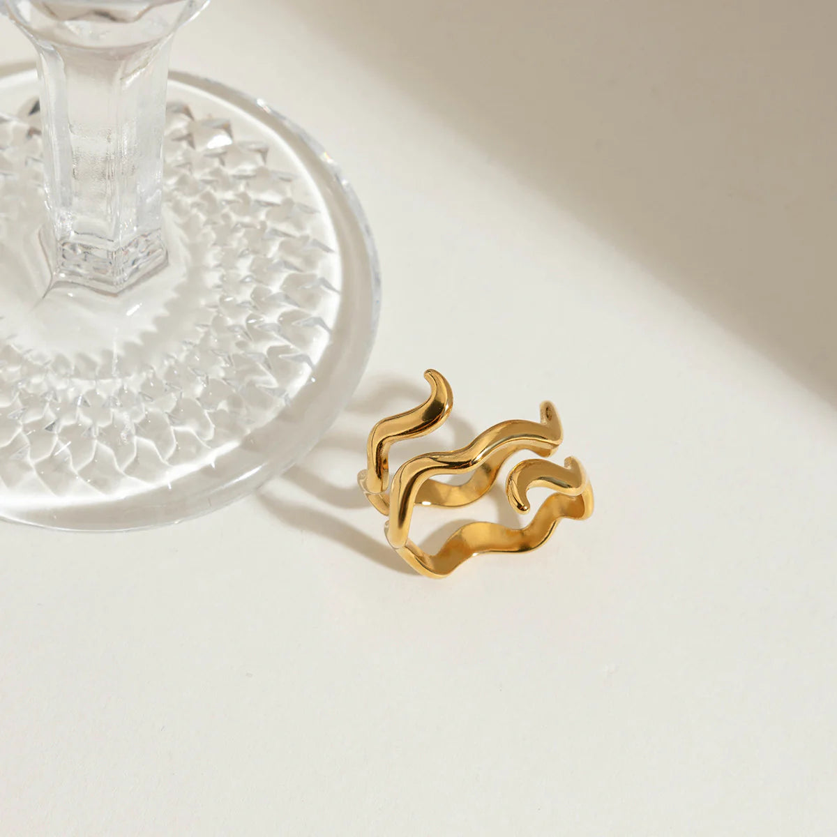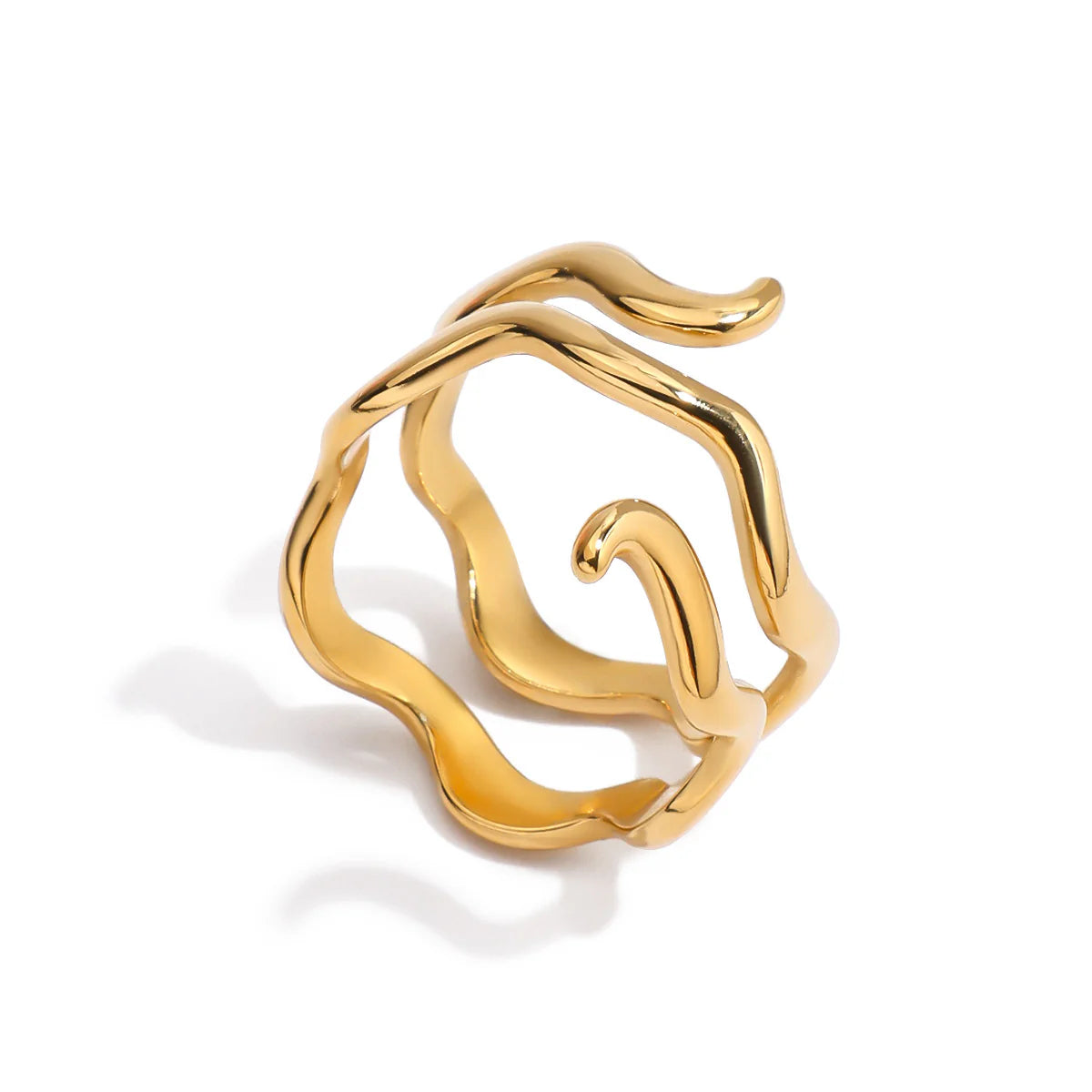 Una joya que se adapta a ti y brilla contigo. Forma orgánica y asimétrica inspirada en el movimiento del oro líquido: curvas suaves, volúmenes ondulados y una espiral fluida que parece congelada en el instante perfecto. El baño grueso en oro 18k y el acabado pulido espejo reflejan la luz de forma hipnótica, cambiando con cada ángulo y movimiento del dedo.